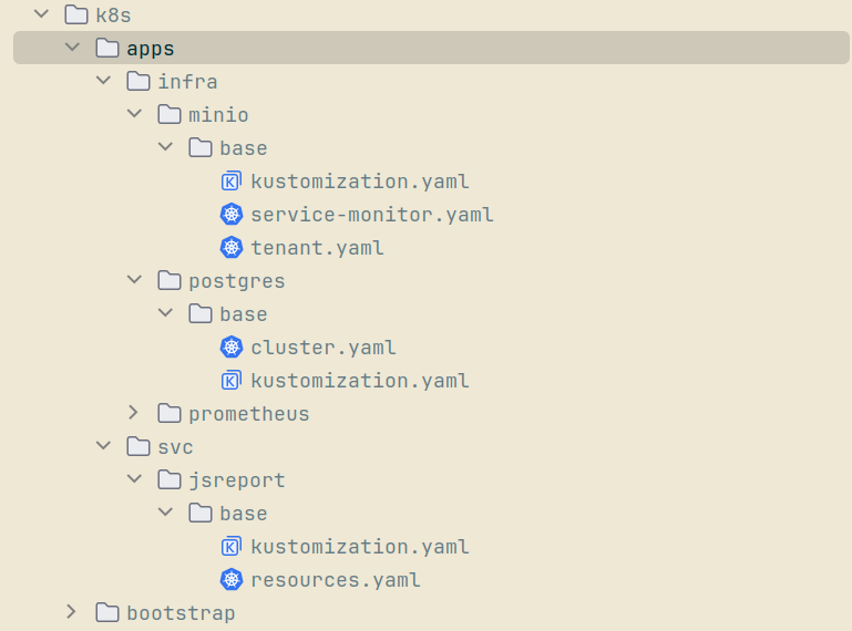 directories. For example, base/cluster.yaml and base/kustomization.yaml are located together for PostgreSQL